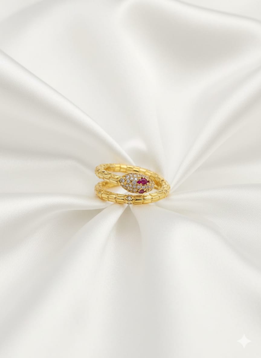 خاتم الأفعى المرصع بالكريستال.. قطعة تعكس القوة والجاذبية. صُمم بأسلوب عصري يلتف حول إصبعكِ ليمنحكِ إطلالة ملكية لا تُنسى.