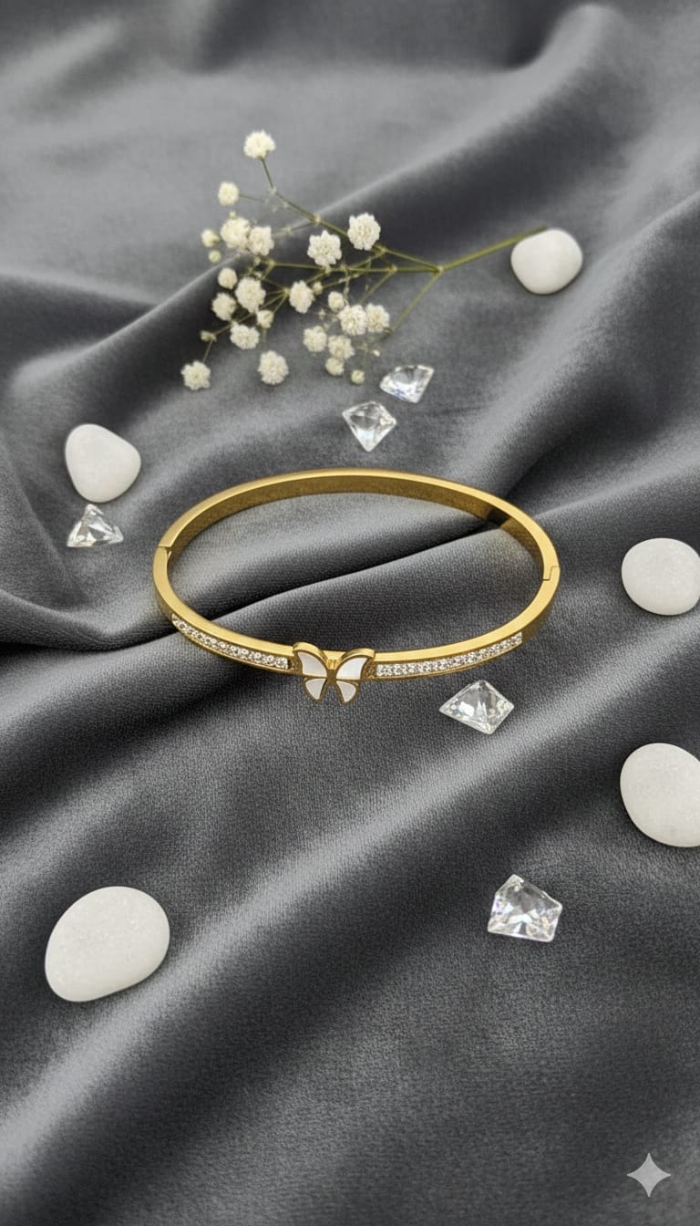 أكملي أناقتكِ مع هذا السوار الذهبي الراقي بتصميم الفراشة. قطعة ناعمة تلتف حول معصمكِ لتمنحكِ بريقاً لا يُقاوم.